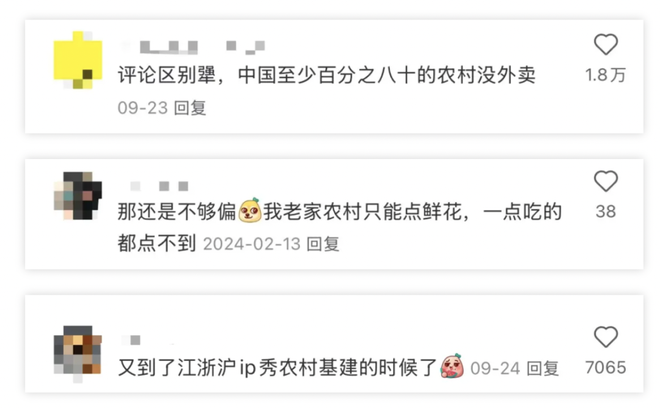 零星有网友分享自己在农村点上外卖的帖子,评论区也会断定“那就不是真农村”“还是不够偏远”。