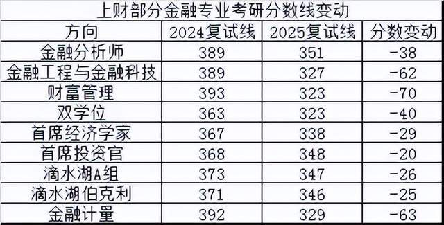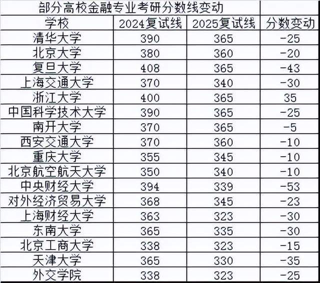 以金融专硕为例,据中国经营报报道,复旦大学2025年硕士研究生复试分数线为365分,较去年降低43分;中央财经大学2025年硕士研究生复试分数线为339分,较去年降低53