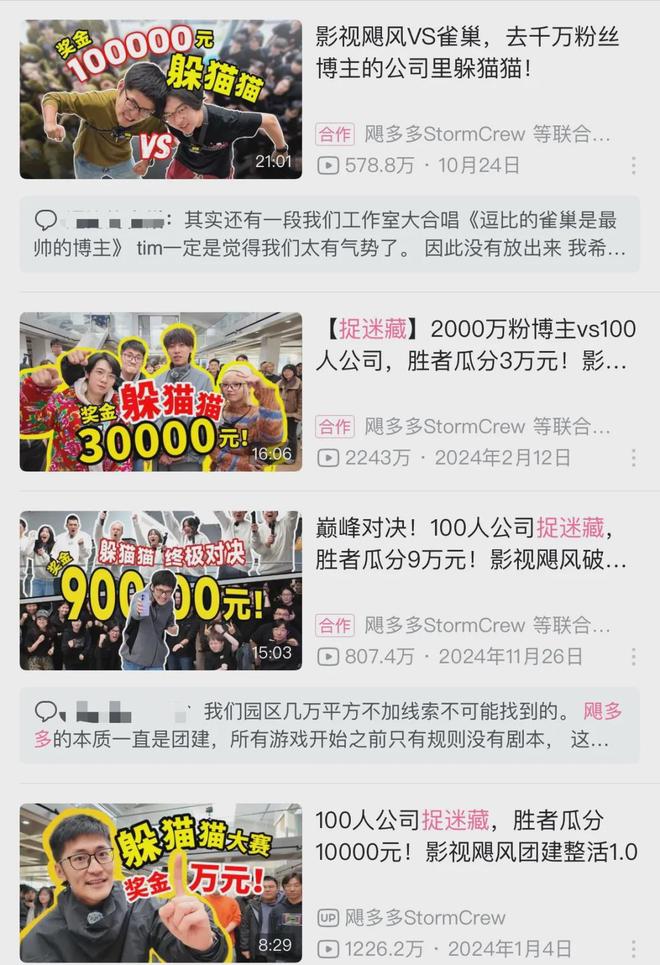 影视飓风的子账号“飓多多StormCrew”推出的综艺向《捉迷藏》系列,播放量都很高