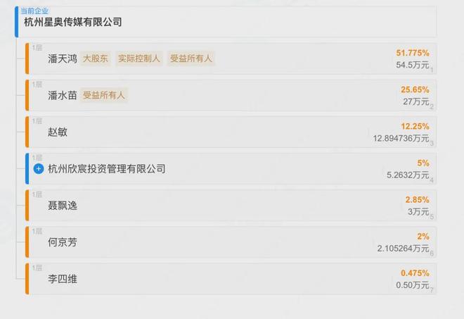在杭州星奥传媒文化有限公司的持股信息里,潘水苗有25.65%的持股