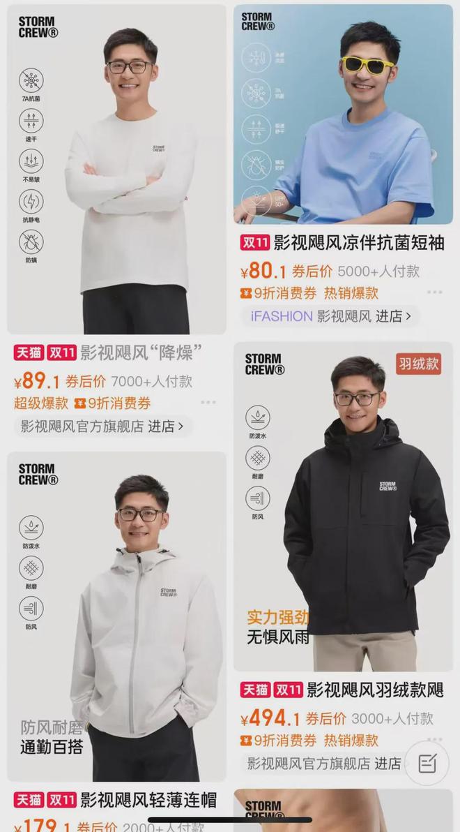 在购物平台的橱窗里,影视飓风主要贩卖的是以男性衣服为主的产品,这也是他们主要的粉丝群体。