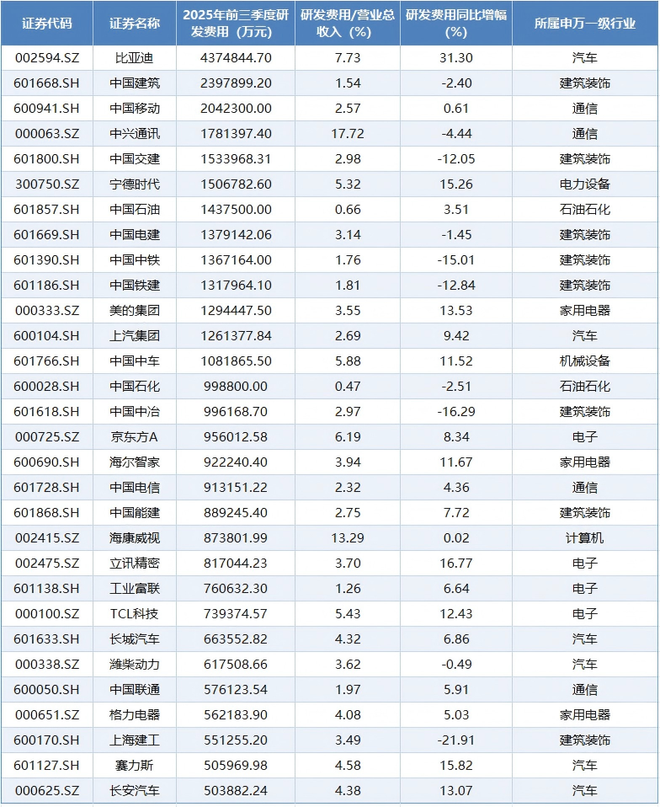 除上述企业外,中兴通讯(000063.SZ)、中国交建(601800.SH)、宁德时代(300750.SZ)、中国石油(601857.SH)、中国电建(601669.SH)等公司的研发投入也排名靠前,并且都超过了百亿元。
