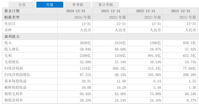 拼多多的低价是公认的。2021年至2024年拼多多的净利润分别为77.69亿元、315.4亿元、600.3亿元和1124亿元,净利润四年内翻了近15倍。净利率的大幅提升更是佐证了低价策略的盈利能力。同期拼多多净利率分别为8.27%、24.16%、24.24%和28.55%,净利率呈现逐年提升趋势。尤其是2024年销售毛利率大幅下滑2.04个百分点的情况下,净利率却大幅提升了4.31个百分点。而2023年拼多多销售毛利率高达75.90%, 净利率只有24.16%,2024年的销售毛利率只有60.92%,净利率却提升至28.55%。