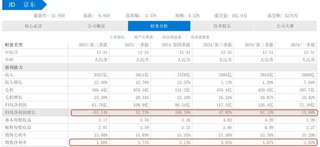 不久前京东发布的2024年二季度财报也给刘强东决心求变的勇气。京东二季报显示,营收3567亿元,同比增长22.40%,增速远高于上一年同期的1.2%。 今年二季度61.78亿元的净利润却远低于上一年同期的126.4亿元。净利润也由去年同期的4.67%大幅下滑至1.88%,净利率甚至不如上一年的一半。刘强东面临的一大困境就是营收增长明显,净利润却下滑明显。