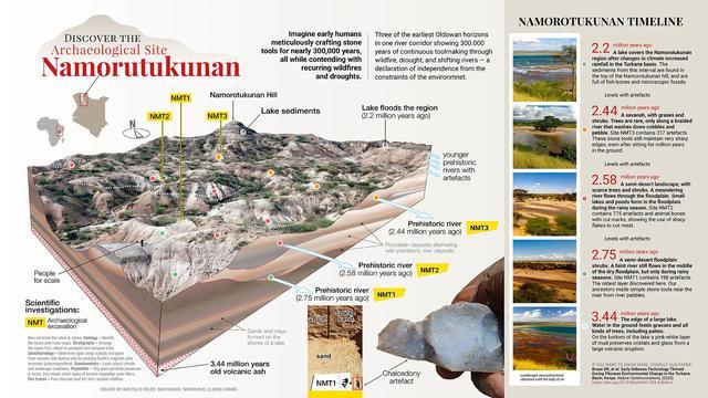 在Namorotukunan遗址,国际研究团队发现了迄今为止最完整、最古老的早期奥都万(Oldowan)石器记录之一,年代约为275万至244万年前。这些工具类似最早的多功能“瑞士军刀”,由古人类制造。研究显示,我们的祖先不仅仅是在艰难的条件下生存,反而是在地球历史上最不稳定的气候时期繁荣发展。