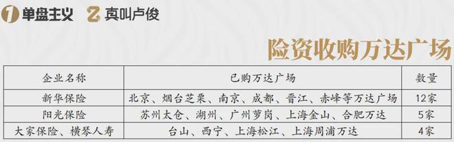 而万达广场的收购方主要为险资企业,如新华保险、阳光保险、大家保险、横琴人寿等