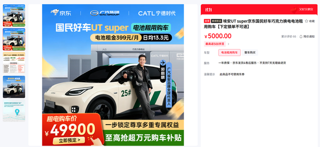 日前,京东联合广汽集团与宁德时代正式发布“国民好车”——埃安UT super,成为京东汽车布局的重要一步。新车提供两种购买方案:租电价仅需4.99万元,整车买断价为8.99万元,将在京东平台独家发售。消费者可通过京东App搜索“国民好车”进行试驾预约或下单支付定金,目前支持500元意向金(可退,支持白条免息)和5000元锁单定金(不可退)。但需要注意的是,目前定车暂不支持打白条。