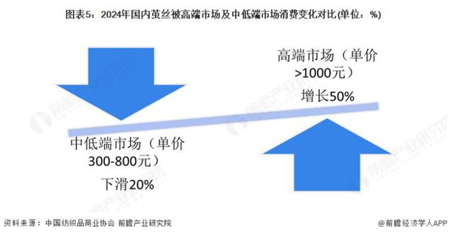 具体从消费规模上看,2024年国内蚕丝被高端市场(单价>1000元)增长50%;相比之下,中低端市场(单价300~800元)在2024年则呈现下降趋势,同比下滑20%。
