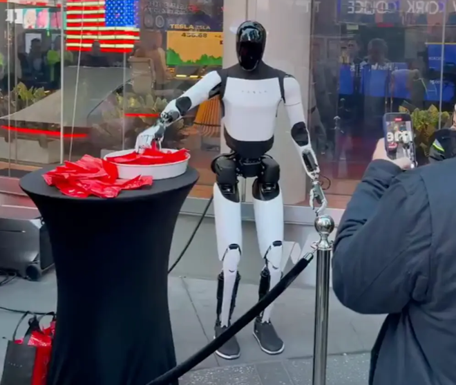 特斯拉机器人Optimus(代号“擎天柱”) 被埃隆·马斯克称为特斯拉未来战略的核心,“预计将是机器人史上市场规模最大产品”,但它现在能做到的最亮眼的公开展示是发糖。今年万圣节前夕,Optimus现身纽约时代广场给路人发糖果。当糖两次掉在地上时,它都弯腰捡了起来。特斯拉并没有公开说明这次行动是机器人独立完成的,还是由人远程操控。