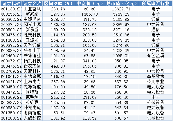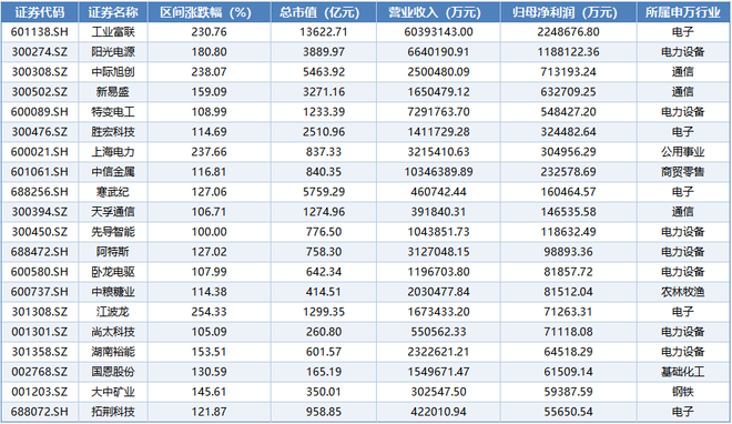在翻倍股中,92家企业市值超过100亿元,22家企业市值超过500亿元,10家企业市值超过1000亿元,3家企业市值超过5000亿元,1家企业市值超过13000亿元。其中,工业富联(601138.SH)总市值排在首位,达到13622.71亿元,紧随其后的是寒武纪(688256.SH)、中际旭创(300308.SZ),市值分别达到5759.29亿元、5463.92亿元。