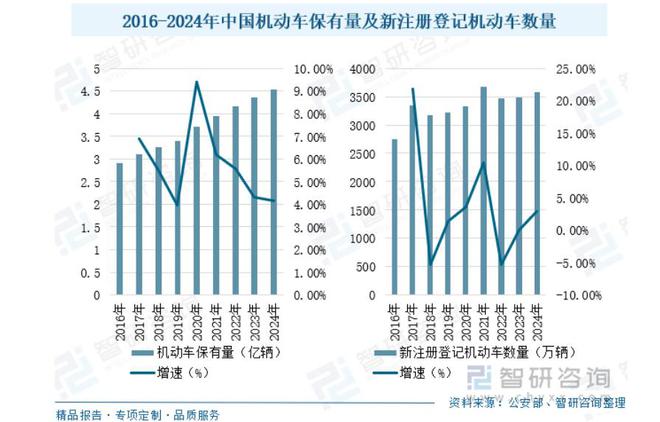 公安部数据显示,中国机动车保有量从2016年的2.9亿辆增长至2024年的4.53亿辆,年复合增长率为5.73%;2024年全国新注册登记机动车3583万辆。值得注意的是,机动车新注册登记量已连续10年超过3000万辆。