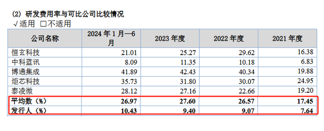 虽然杰理科技的研发费用和研发费用率不断提升,但仍然远低于同行业可比公司平均值。2021年至2023年以及2024年上半年,杰理科技的研发费用率基本比同行业平均值要低十多个百分点。