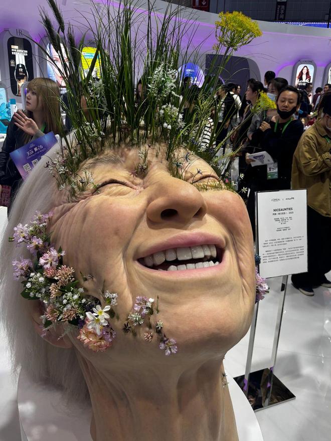 在欧莱雅展台放置着一个巨大的“长草奶奶”雕塑,“美丽的脸蛋也是有皱纹的”,脸的上半部分被葱郁的花草包围,摸了一下,手感很扎实。