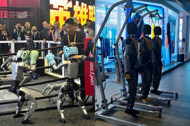 宇树科技戏班子最卖力,虽然拳击对垒的时候自己先被空气抡倒,但3秒起身才是拿手绝活,另一边还有会跳“来财”的机器人引得围观人类一片叫好。还有些机器人主要起到惊吓和惊悚作用,比如非得套层女性皮肤的,和被吊着脖子、临街示众的。总之,我们保存了大量机器人祖先“屈辱”的珍贵影像。