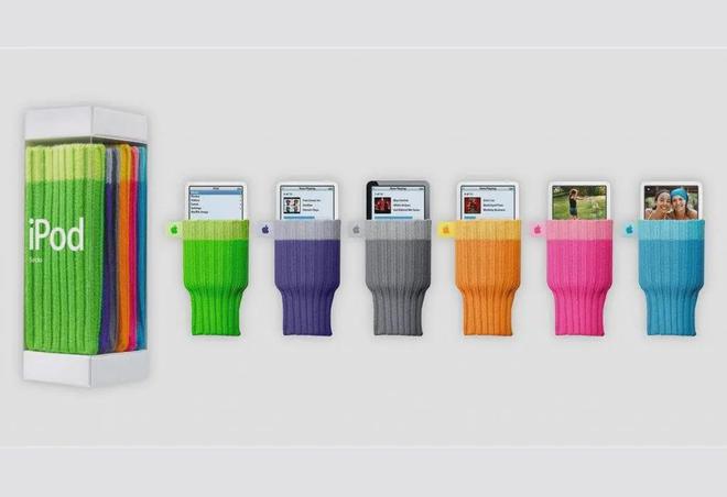2004 年,苹果推出了一盒六色的 iPod Socks,售价 29 美元,采用针织材质,适配当时几乎所有 iPod,也能收纳耳机、数据线、钥匙,甚至还能用针织表面顺手擦屏。