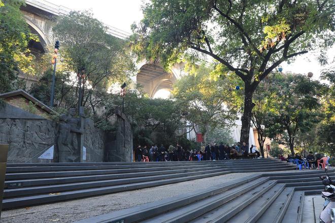 在斗级营西入口处,老人们围坐在汉阳门花园内中老枫杨树下,讲述着民主路过往的故事,孩子们在一旁嬉戏,笑声清脆响亮。站在汉阳门花园观景平台上,极目远眺,长江的壮阔与大桥的雄壮尽收眼底。此刻,时间仿佛凝固,让人忘却尘世的烦恼,沉浸在这份宁静与美好之中。