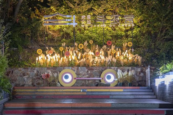漫步斗级营街区,改造过程中留存的斗级营的梧桐树,巍峨挺拔,屹立在斗级营街区内,见证了街区无数岁月的变迁。白天,青砖黛瓦间镌刻着时光的印记,阳光透过民国风格的窗棂斜斜地洒落在巷子里,恰似一幅灵动的千年古画。夜幕降临之际,坐落在斗级营山坡上的街区LOGO与仿生萤火虫灯串沿着绿道逐一亮起(见下图),空中廊桥的光影于青砖墙上缓缓流淌,暖黄色的灯光为飞檐翘角勾勒出一道金边,整条街巷刹那间变得浪漫起来。