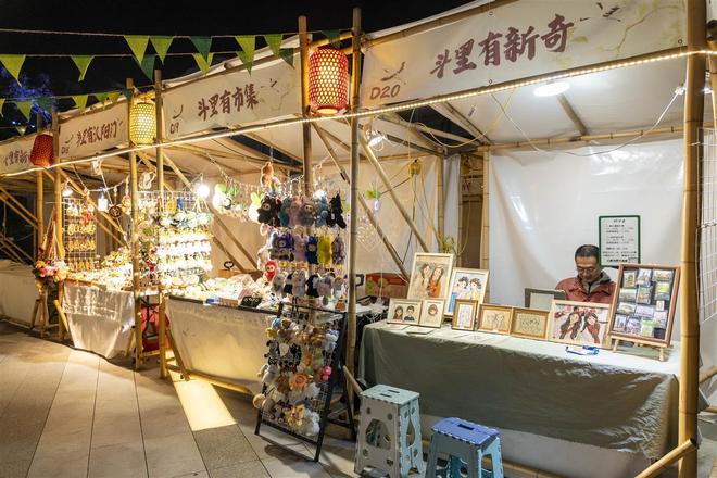 而斗级营东侧,老一辈武汉人记忆中的司门口天桥之下,曾是通往黄鹤楼与万里长江第一桥的必经之路,是名副其实的“黄金走廊”。斗级营在“黄金走廊”上,以竹节和古风元素精心打造的“斗里有市集”布局精巧,与户部巷大舞台“隔街相望”,18个摊位秩序井然地营造出一方闲适惬意的“慢空间”,人们可以在这里轻松地逛街、拍照,享受被文创和趣味包围的惬意。
