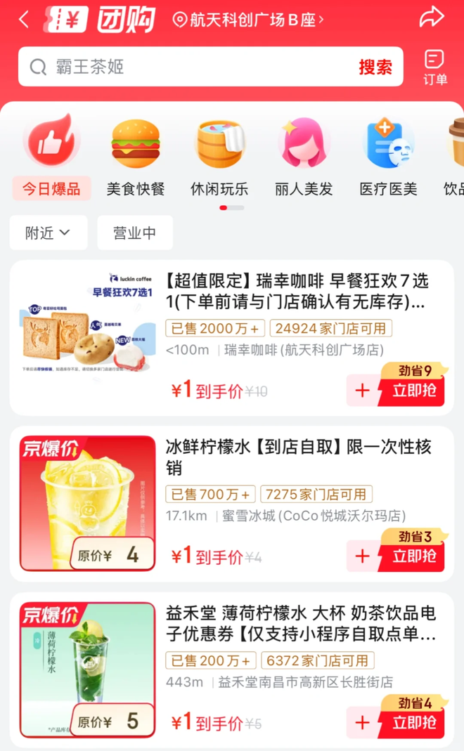 但京东的团购体量和美团比起来只能算“闹着玩儿”:整个【美食】页面只有瑞幸、蜜雪冰城、霸王茶姬、永和大王等不超过20个商家。