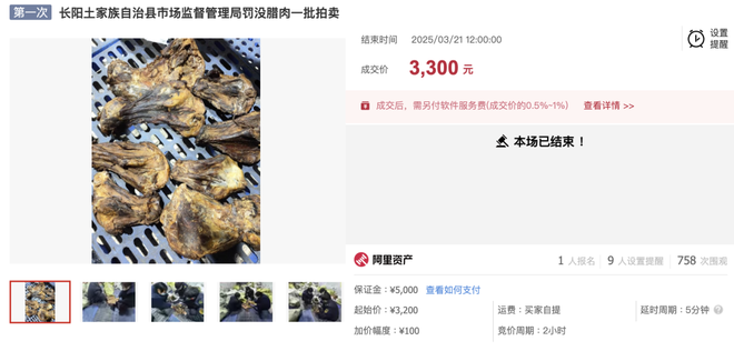 和高淳螃蟹类似,物美价廉的地方土特产们也颇有拍卖潜质。今年3月湖北长阳土家族自治县法院挂上了一批腊肉,属于市级非物质文化遗产,由市场监督管理局罚没而来。最初的商品标题不小心误写成“那肉”,还带点南方NL不分的亲切口音。成交价3300元听着不少,但包含425公斤先板骨和75公斤五花肉皮,算下来每斤才3块3,比菜市场还要温柔。
