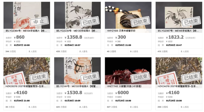 其实,这不是法拍里第一次出现螃蟹,但确实是罕见地出现能吃的活螃蟹。之前多是文玩字画,还有普洱生茶,一只小叶紫檀螃蟹标价高达6000元,换算过来可以吃到250只真的了。
