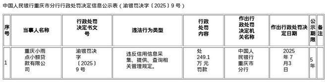 罚单显示,重庆小雨点小额贷款有限公司的主要违法违规事实是:违反信用信息采集、提供、查询相关管理规定。针对这一违法行为,中国人民银行重庆市分行对该公司处以249.1万元罚款。