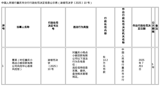 此外,时任重庆小雨点小额贷款有限公司风控中心首席风控官曹某,对该公司的违法违规行为负有责任,被处以14.2万元罚款。