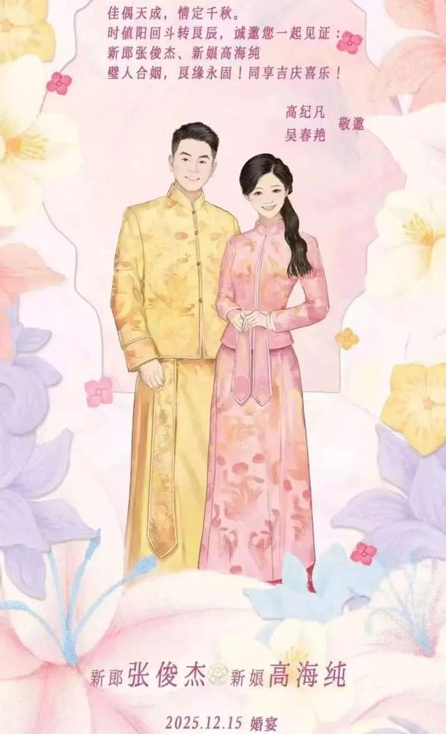 11月19日,网上传出一张请柬。“家主”高纪凡和吴春艳发出请帖,邀请嘉宾参加新郎张俊杰、新娘高海纯的婚礼。婚礼的日期是12月15日,举办地在常州市的酒店。
