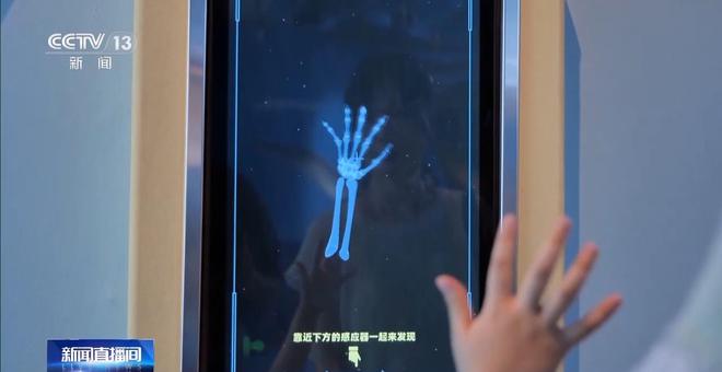 在抹香鲸心脏标本的旁边,还设置了一个心率对比仪,只需要将手指轻轻放在上面,便可测试出自己的心率,还能对比抹香鲸深潜时的心跳次数。而这样的巧思遍布全馆:X光手骨屏,手臂一挥,对比鲸鳍与人类手骨的相似度,连小朋友都能秒懂进化论;体感虎鲸游戏,挥动手臂,模拟虎鲸在大海遨游,动作捕捉技术让虚拟捕食充满刺激。