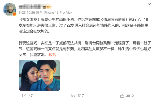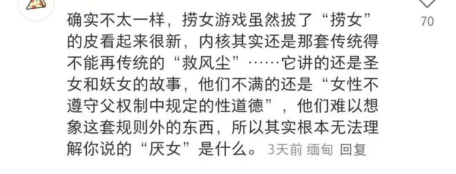 在他们男性视角里,到处都是“捞女”的负面新闻,他认为这部游戏的“现实性”已经超越了游戏的形式,存在即是信仰。