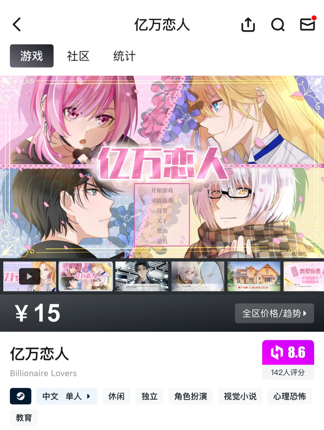 其实说到“以爱之名搞钱”的游戏,曾有一款叫《亿万恋人》的性转版“捞男游戏”。2021年7月因为豆瓣上的一个安利帖子《亿万恋人》这个文字冒险类游戏迅速走红,人称“杀猪盘模拟器”。