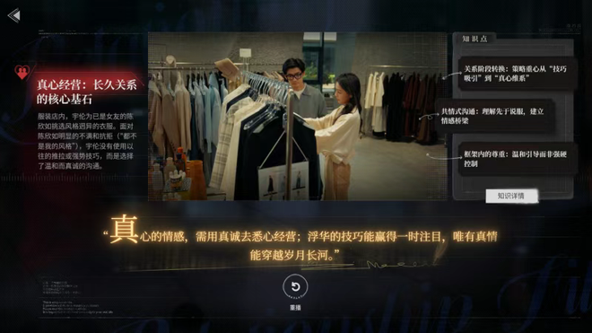 在第三章男主与女主播重逢时,哪怕玩家心里仍然对女主播心怀戒备,“但是看男主的表演觉得他动了真情”。这一刻,更有一种看着男主的故事,难以入戏的旁观者心态。