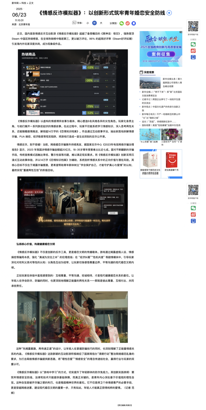 2.华夏时报,成本仅1200万元!《情感反诈模拟器》登顶Steam国区热销榜,互动影游为何频造爆款。2025.06