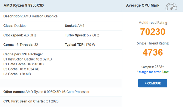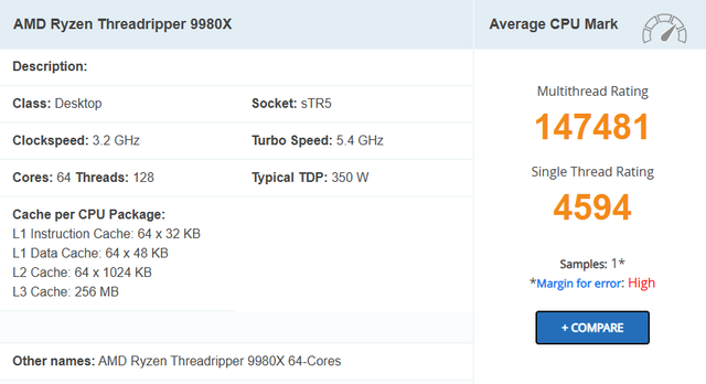 另一方面,Ryzen Threadripper 9980X 是其 Shimada Peak 系列的旗舰产品,但对于追求极致性能的发烧友和专业人士来说,它是一款非常出色的处理器。该处理器最近在PassMark上进行了基准测试,PassMark 是一款测试 CPU 在单线程和多线程工作负载下性能的软件。如您所见,Threadripper 9980X 在多线程测试中获得了高达 147481 分的惊人成绩,稳居榜首。