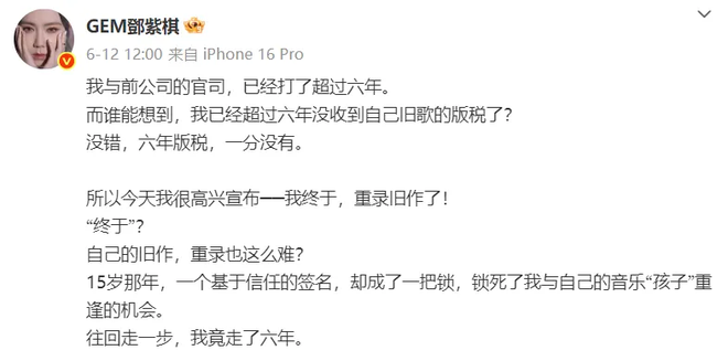 为了解决版税问题,6月12日,邓紫棋的重录专辑《I AM GLORIA》上线,包括对过去12首旧曲的重录。她呼吁所有听自己音乐的人,都可以来支持这一张专辑。因为只有听她重录的版本,版税才归她所有,原版的版权价值才能贬值,她未来也才有更多和前司的议价权。