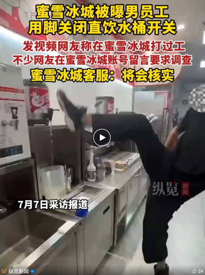 7月7日,一网友发布旧视频爆料称,自己曾在蜜雪冰城门店工作时,用脚踢直饮水桶水龙头关闭,并配文“笑死我了”。视频中可见操作区贴有蜜雪冰城LOGO,引发网友批评“让人喝脚底灰?”视频随后被删除,账号清空。