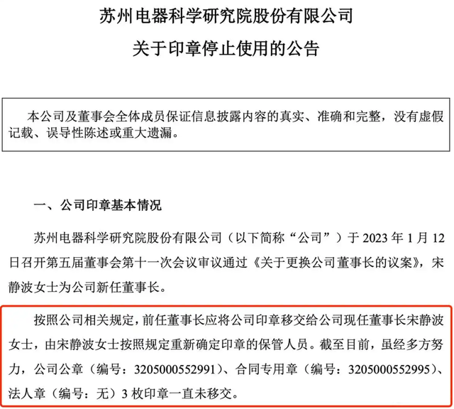 另外,胡醇还拿着公司的公章,电科院一直要求他返还,但是胡醇就是不回应。就这样从1月拖到4月,电科院无奈发布了新的公告,说因为前董事长一直没有把公章、合同专用章、法人章交回,所以公司决定停止使用这三枚印章。