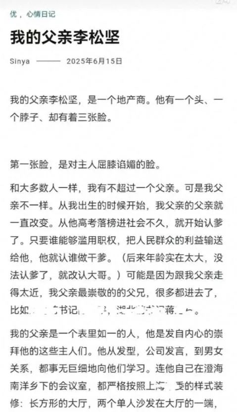 “我的父亲李松坚,是一个地产商。他有一个头、一个脖子、却有着三张脸”
