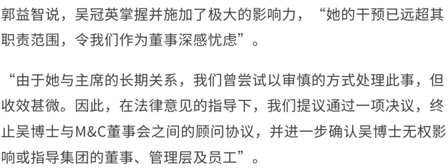 眼看舆论要失控,郭令明立刻深夜发出声明,确认千禧国敦酒店(M&C)董事局已经收到了来自吴冠英的辞呈。他表达了对吴冠英这些年为公司所做贡献的感谢,并祝愿她在未来的事业中一切顺利,同时又点了长子郭益智,说他纯粹是含沙射影,为自己的“政变”和违规行为找理由。