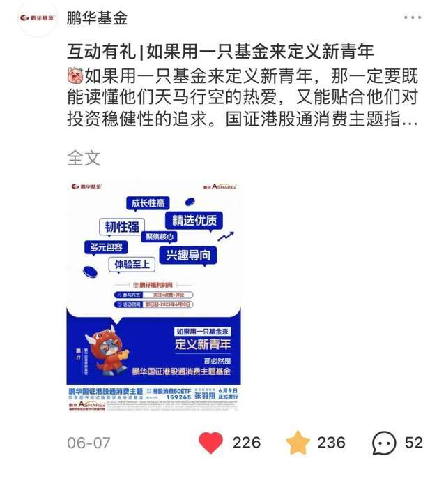 鹏华基金小红书港股消费50ETF相关笔记观看量超7万,评论821条,转发、点赞、分享共3646次,在平台形成较高热度,让更多投资者更多地了解了港股消费50ETF投资价值和特点。