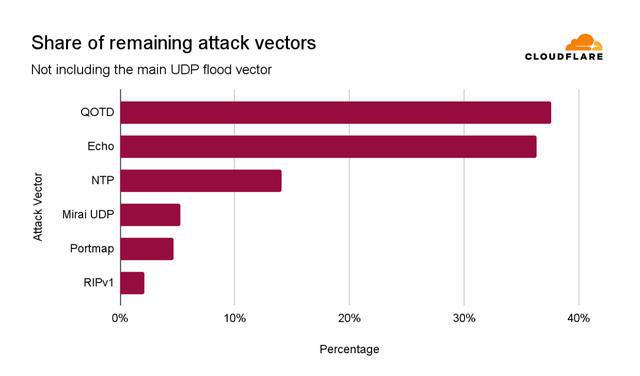 Cloudflare 表示,创纪录的 DDoS 攻击利用了各种反射或放大向量,包括前面提到的网络时间协议、每日报价协议(它在 UDP 端口 17 上监听并以简短的报价或消息进行响应)、Echo 协议(它使用接收到的相同数据进行响应)以及用于识别通过远程过程调用连接的应用程序可用资源的 Portmapper 服务。