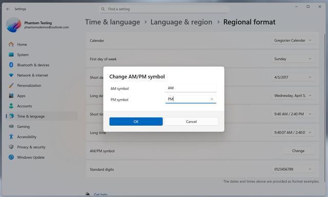 上午/下午指示器也是如此:您可以在“设置”>“时间和语言”>“语言和地区”>“地区格式”中自定义它们。
