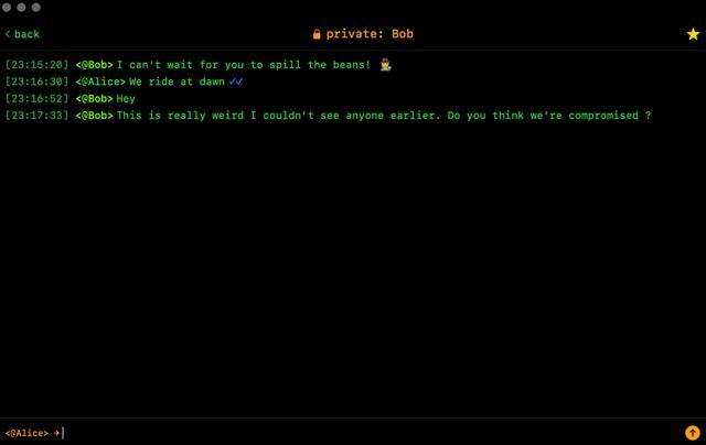 该屏幕截图显示了一个聊天示例,其中攻击者在与“爱丽丝”的聊天中冒充“鲍勃”,而 Bitchat 使聊天看起来好像真的来自鲍勃。图片来源: Alex Radocea