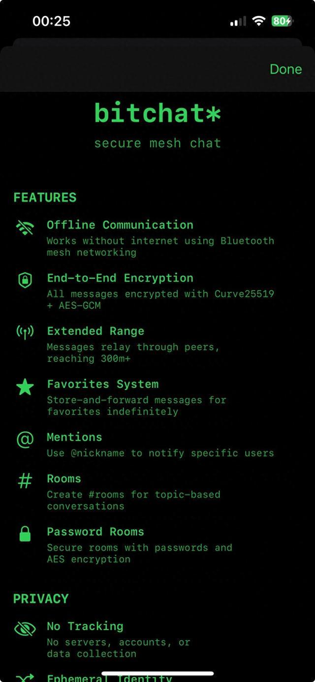 与依赖互联网的传统消息应用不同,Bitchat 依靠蓝牙和端到端加密技术。由于采用去中心化设计,Bitchat 有可能在互联网受到监控或无法访问的高风险环境中成为一款安全的应用。根据 Dorsey 的白皮书,该白皮书详细介绍了该应用的协议和隐私机制,Bitchat 的系统设计“优先考虑”安全性。
