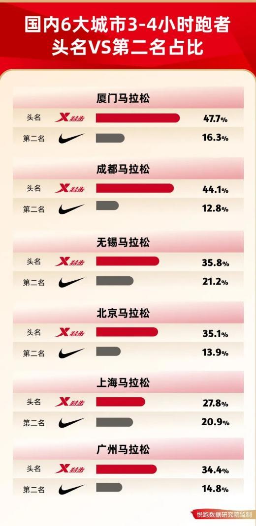 在去年北马的时候,《节点财经》的研究员有一个观察,国产跑鞋的占比首次突破半数,达到57.3%。悦跑数据研究院的统计显示,国产运动品牌特步在厦门、无锡、成都、北京、上海、广州6场国内高水平马拉松赛事中,实现"破3"选手穿着率占比"6冠王",国产品牌成为这些大众精英马拉松选手的首选。