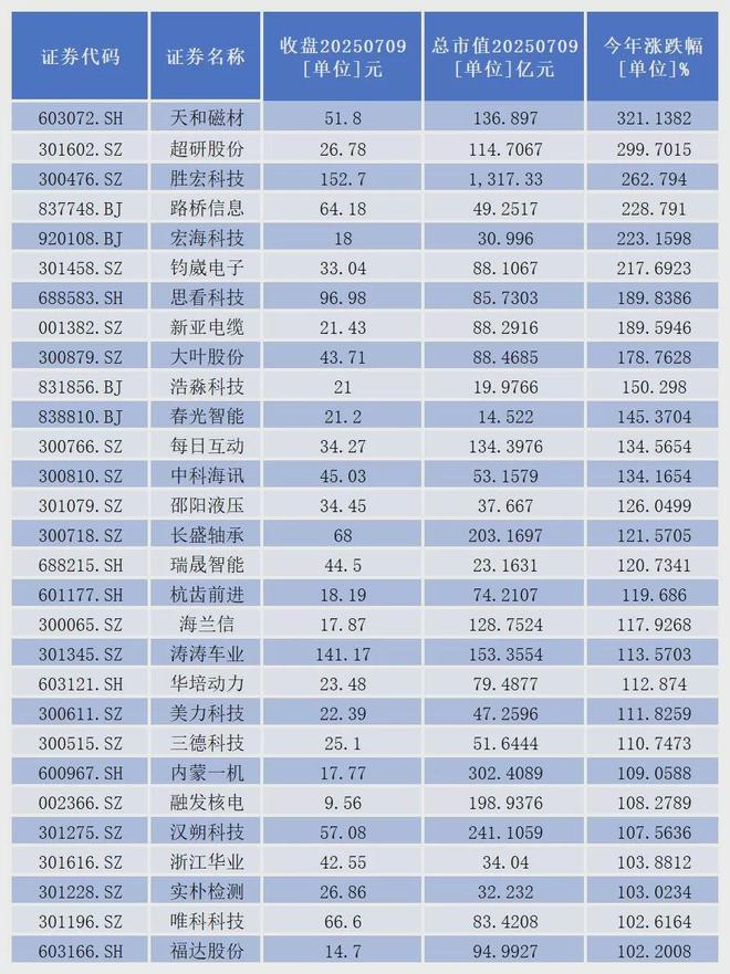 从二级市场表现看,今年以来,A股机器人概念板块已诞生29只翻倍股,其中,天和磁材、超研股份、胜宏科技、路桥信息、宏海科技、钧崴电子涨幅均超过200%。