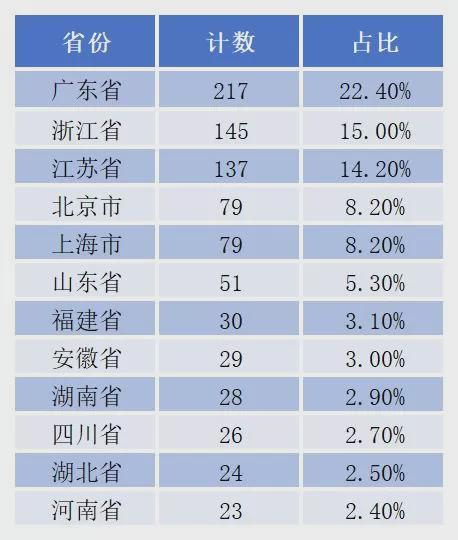 从地域分布看,根据省份划分,广东有217家,占比22.4%;浙江有145家,占比15.0%;江苏有137家,占比14.2%。
