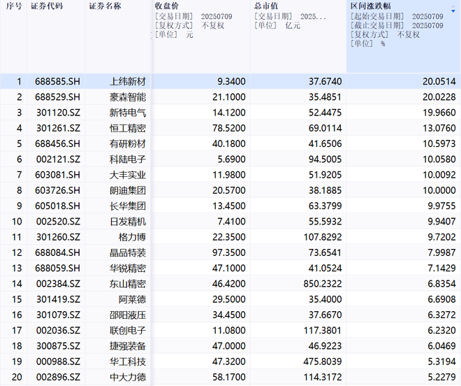 从行业板块看,机器人概念表现活跃,上纬新材、豪森智能、大丰实业、朗迪集团等多股涨停,晶品特装、华锐精密、东山精密、阿莱德等涨超6%。