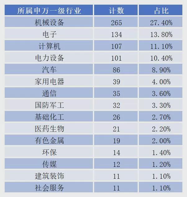 从行业分布看,根据所属申万一级行业分类,机械设备有265家,占比27.4%;电子有134家,占比13.8%;计算机有107家,占比11.1%;电力设备有101家,占比10.4%。