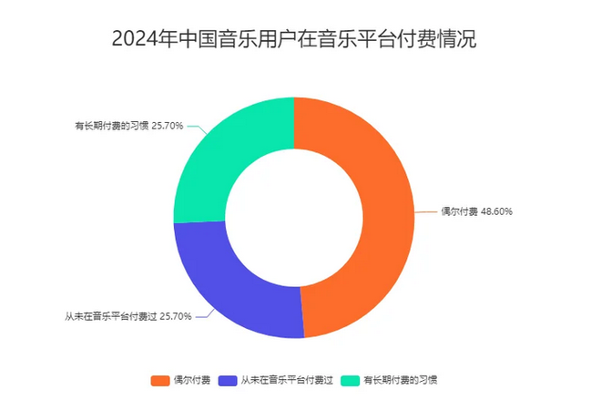 不过,根据《2024年中国音乐行业发展状况与消费行为调查》报告,当前付费用户虽已成为数字音乐平台的重要组成,但整体比例仍偏低:48.6%的用户仅"偶尔付费",真正具有长期付费习惯的用户仅占25.7%,而另有25.7%的用户从未为音乐内容付费。